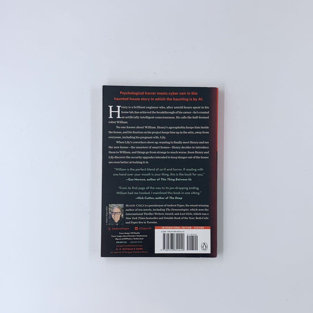 Not human. Not machine. A being that's eerily prescient and hungry for revenge...Henry, a brilliant but agoraphobic robotics engineer, has achieved the crowning discovery of his he's created an artificially intelligent consciousness. He names the half-formed robot William and spends most of his hours studying it in his attic laboratory. But all is not right with William. The A.I. is filled with jealousy for humanity, for its capacity to love and create life. Henry is uneasy at first, then terrified when William develops an unsettling fixation on Henry's pregnant wife Lily. Left with no other choice, he is forced to terminate the A.I, but somehow William's consciousness survives. Henry and his wife wired their home to be the smartest of smart homes, a decision that may prove fatal since a vengeful William has now seized control of the house and its inhabitants. William is a lean, mean genre-bending novel that shifts seamlessly from psychological thriller and cyber-noir to haunted house horror and locked-box mystery. From the moment we meet Henry to the novel's surprising end, William will have readers on the edge of their seats, constantly asking themselves just what is going on?