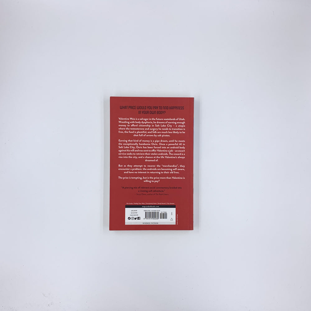 Valentine Weis is a salvager in the future wastelands of Utah. Wrestling with body dysphoria, he dreams of earning enough money to afford citizenship in Salt Lake City - a utopia where the testosterone and surgery he needs to transition is free, the food is plentiful, and folk are much less likely to be shot full of arrows by salt pirates. But earning that kind of money is a pipe dream, until he meets the exceptionally handsome Osric.