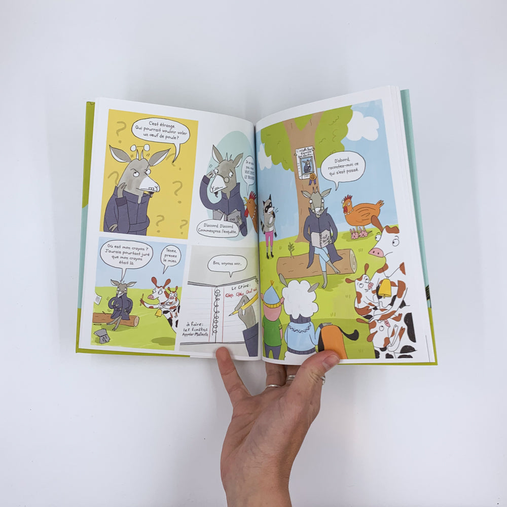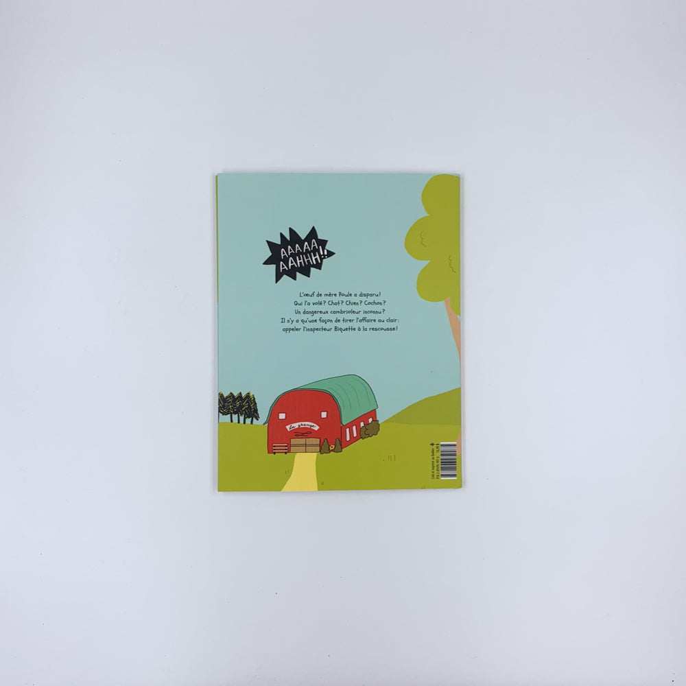 C'était un jour tranquille comme les autres à la ferme lorsqu'un cri à glacer le sang a retenu dans le poulailler. Ah non ! On a volé l'oeuf de mère Poule ! Qui donc a pu faire une chose choisi pareille ? Voilà du travail pour l'inspecteur Biquette. Tous les animaux de la ferme participent à l'enquête menée par le très peu perspicace et pas du tout débrouillard bouc détective. Une bande dessinée absurde mais irrésistible !